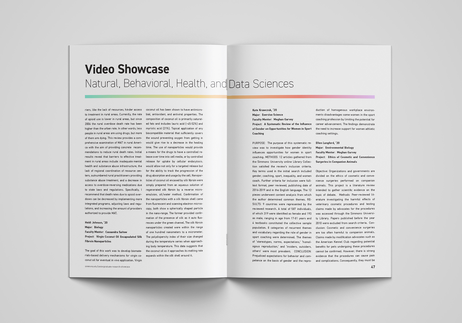 I was asked to design the 2020 Undergraduate Symposium brochure for Simmons following a successful completion of the 2019 brochure. Unfortunately, due to COVID-19, the in-person event was cancelled, but the symposium organizers had a vision for a virtual showcase, which consisted of an archive of video presentations where students could show their research.